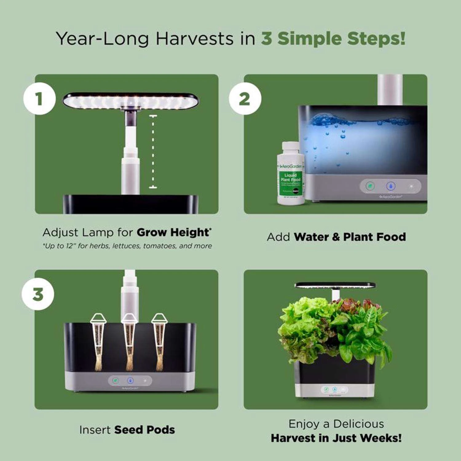 | What's Included | AeroGarden Harvest, Black, Gourmet herbs 6-pod seed kit (Basil, Thai Basil, Thyme, Mint, Curley Parsley and Dill), Liquid Plant Food, Quick Start Guide |