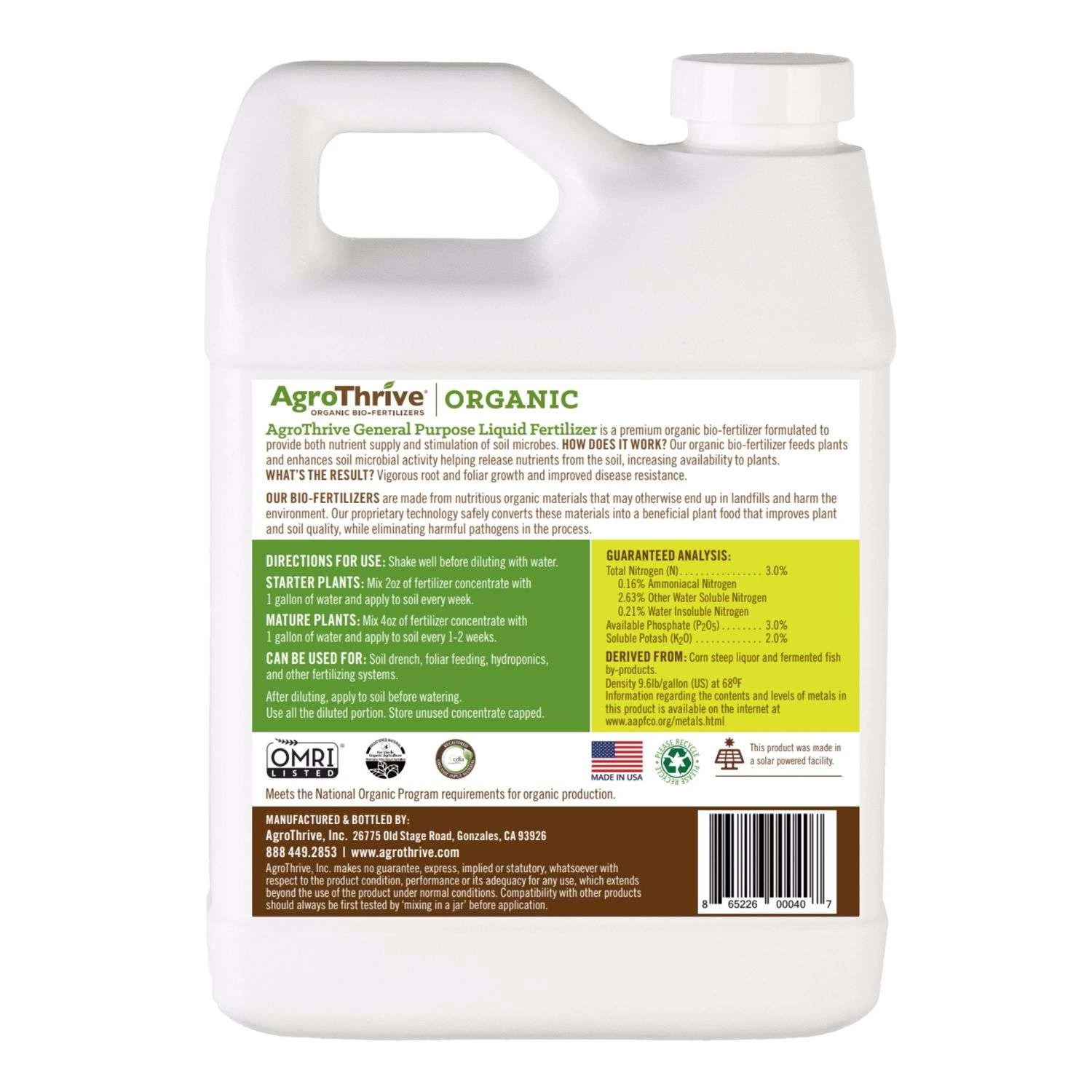 AgroThrive has produced over 13 million of liquid organic fertilizer for the largest certified organic farms in California and beyond. We are now packaging our most popular, National Organic Program compliant, liquid organic fertilizer for ACE home gardeners ACE customers will be able to use the same fertilizer their store bought fruits and veggies are grown on in their home gardens. General Purpose Fertilizer is a nutrient rich organic bio-fertilizer that feeds and protects plants by providing a wide array macro and micro nutrients, plant beneficial microbes and by feeding beneficial microbes that are already in soil. The results are vigorous root and foliar growth, improved disease resistance and higher yields. General Purpose organic fertilizer is formulated for Everything that Grows. AgroThrive liquid organic fertilizers can be used for cuttings, foliar feedings, soil drench, vegetation, flowers, hydroponics, greenhouse, soil and other media. We believe the future of food production and home gardening lies in reducing reliance on pesticides and chemical fertilizers, increasing organic inputs and responsible environmental stewardship. Suitable for organic production (OMRI and CDFA certified) Manufactured in 100% solar powered facility in the USA Promotes vigorous root and foliar growth and improves plant disease resistance