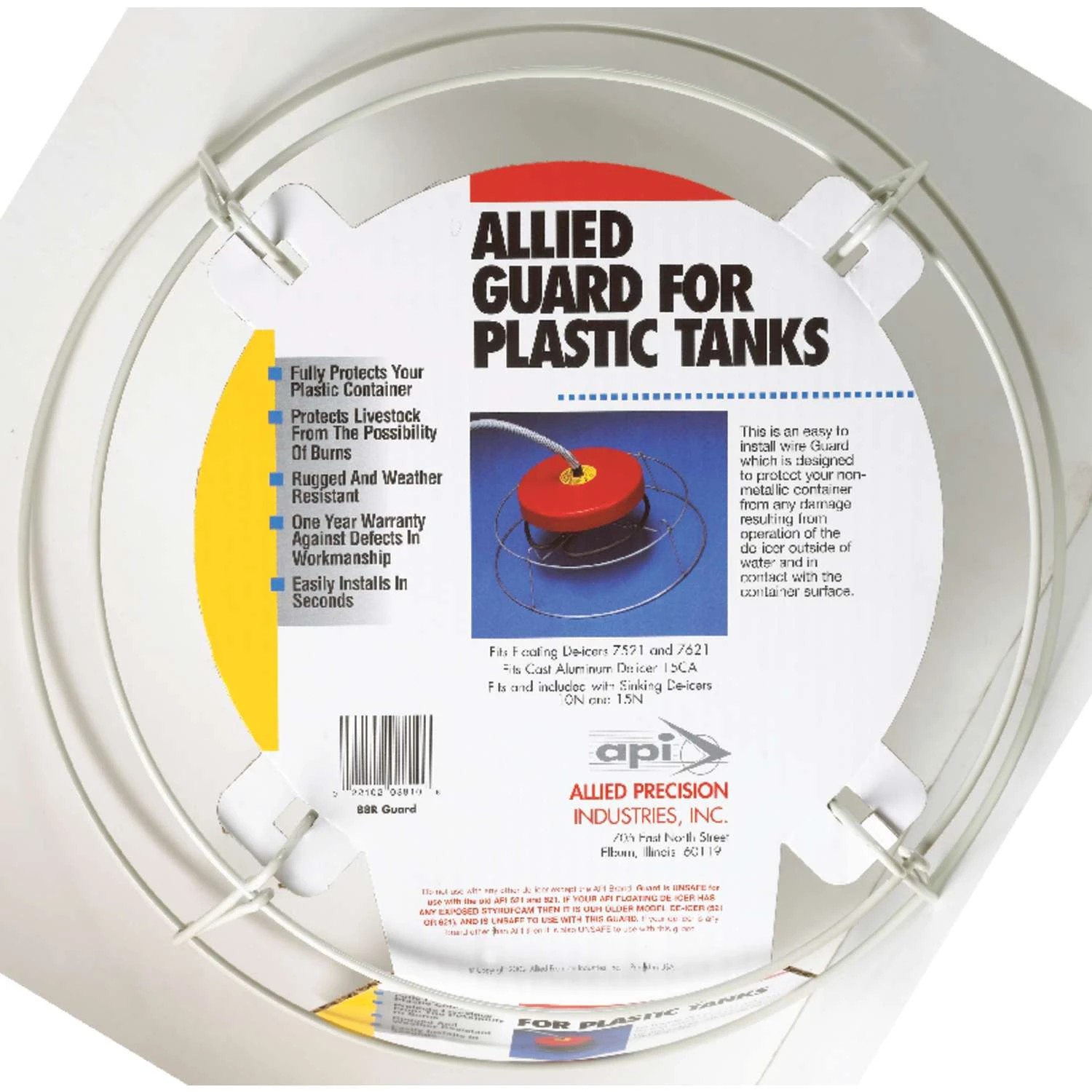 This is an easy to install wire Guard which is designed to protect your non-metallic container from any damage resulting from operations of the de-icer outside of water and in contact with the container surface. Fully protects your plastic tank from contacting de-icer heating element Protects livestock Easily installs in seconds Fits API models 7521, 7621, 10N and 15N
