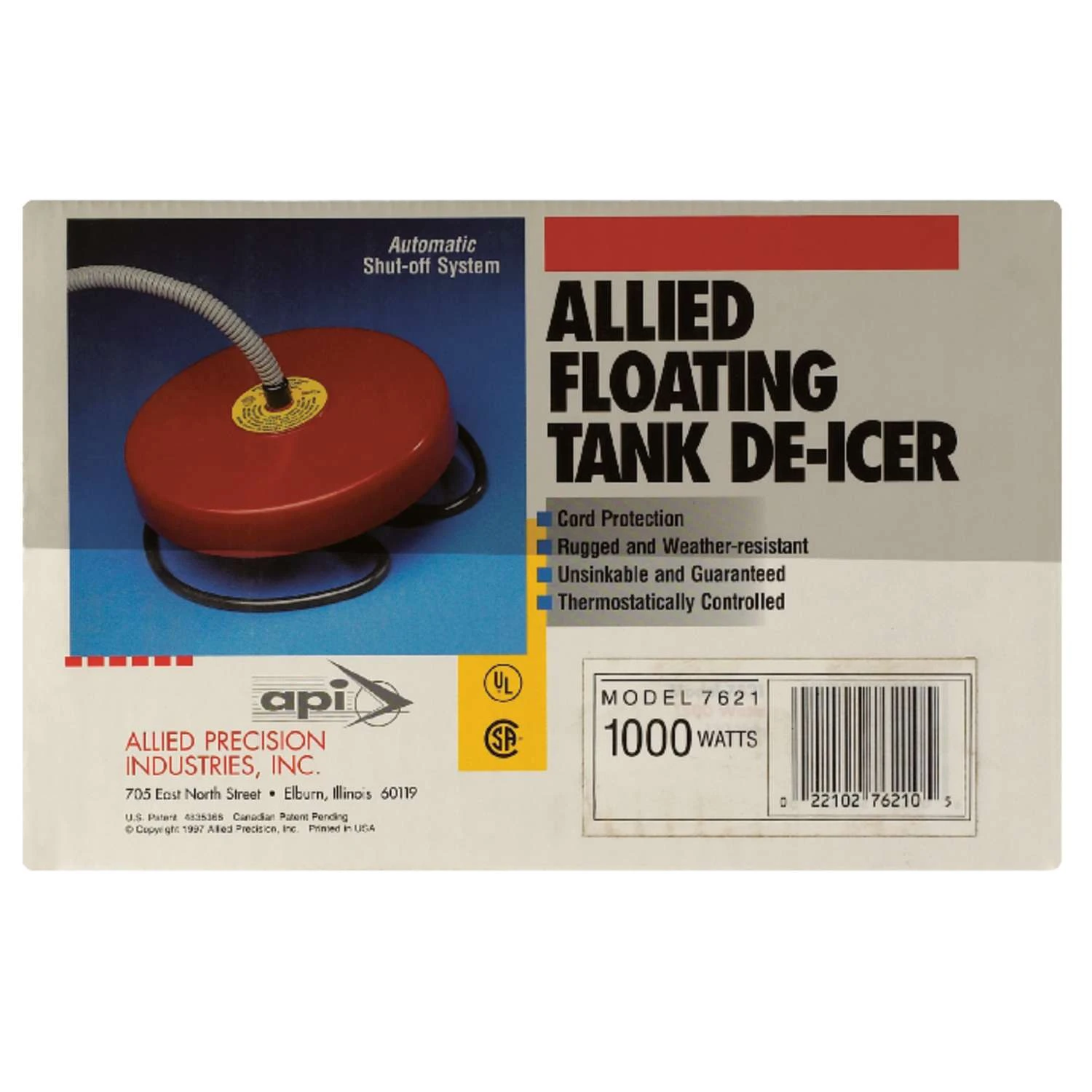 The Floating De-Icer will keep a stock tank completely ice-free all winter. The thermostatic control coupled with thermal feedback protects the unit from overheating and ensures efficient operation. The stainless steel heating element is positioned above the thermostat for safey even in low-water conditions. The float is completely enclosed in a rugged, plastic housing and will not sink over time. Shuts off when removed from tank Over temperature protection 6 ft. steel coil electric cord Energy-efficient operation keeps 70-100-gallon stock tank ice free without overheating UL, CSA listed Use in a non-metallic tank requires a metal guard to prevent fire danger