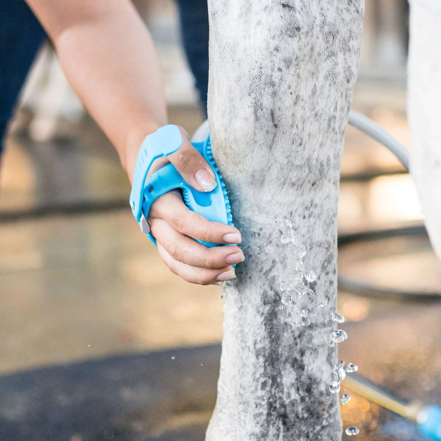 The Aquapaw® Equine Grooming Tool is the world’s first combination curry comb and water sprayer-in-one that can be turned on and off with the simple click of a button. It can be operated entirely with one hand and allows you to rinse and brush your horse simultaneously so you can save time and water at your stable. Simple click on, click off with one hand 100% silicone body is phthalate, BPA andPVC free Adjustable strap fits all hand sizes Gentle and strong 2-settings Adapters included Flap reduces water flowing down wrist