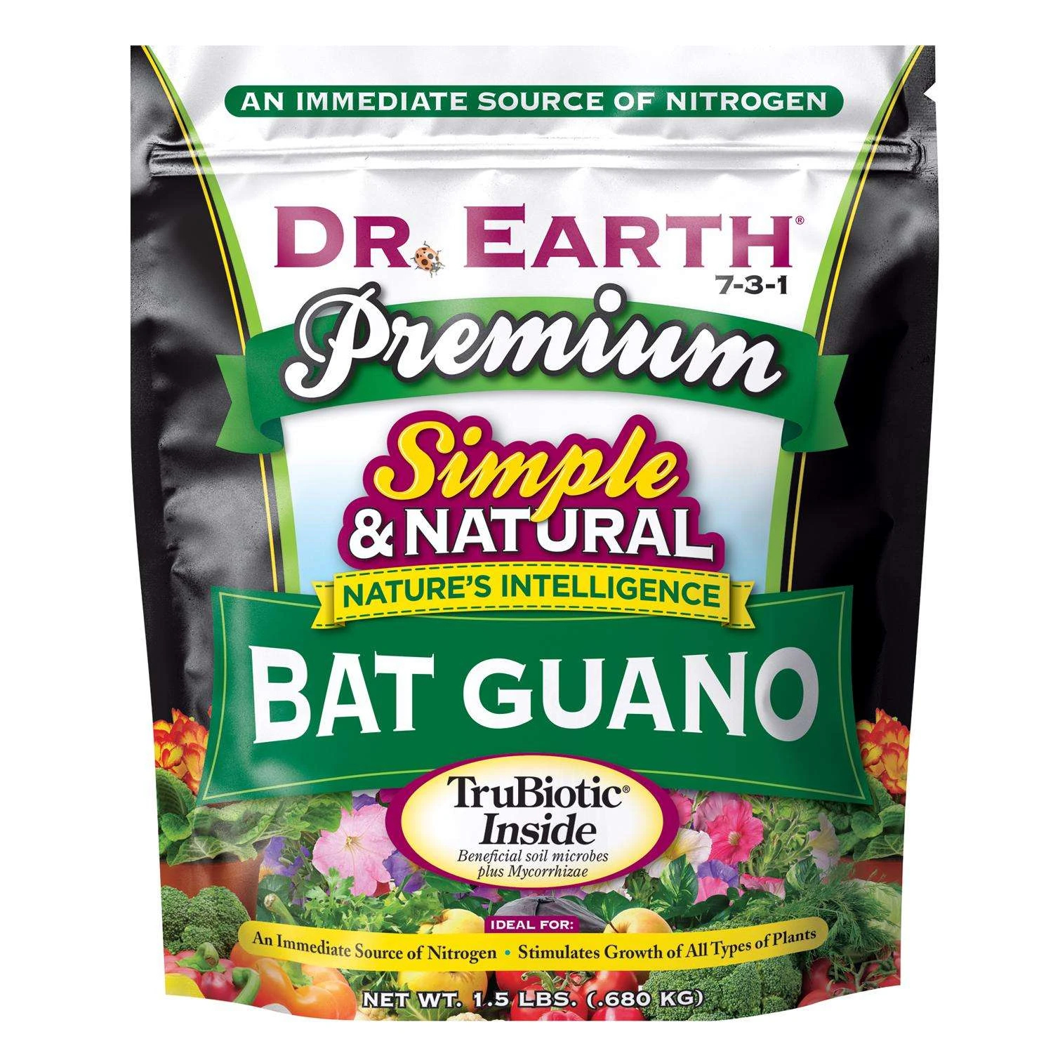Dr. Earth Bat Guano is an excellent source of fast acting nitrogen. Promotes growth of all types of plants. Can be used in a fertilizer tea for all applications. Contains TruBiotic microbes and mycorrhizae Ideal for all plants in your garden Feeds up to 8 weeks People and pet safe