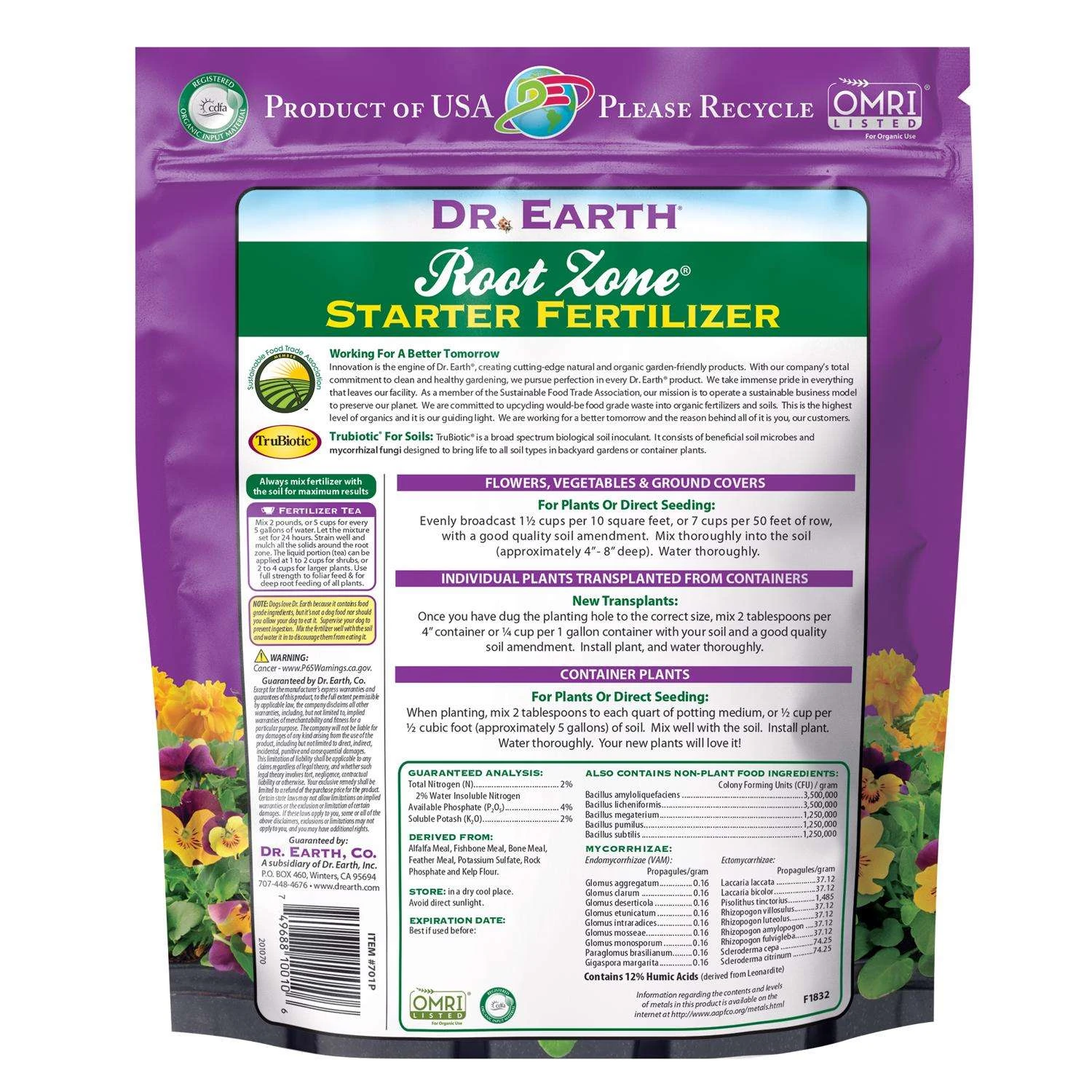 Root Zone fertilizer is formulated to feed all transplants, vegetable garden plants, both summer and winter plants, in containers or in native soil found in your yard. It is best used when planting seeds or transplanting anything into a new container or at home in the garden. No synthetic ingredients or GMO infested chicken manure Contains TruBiotic beneficial soil microbes plus mycorrhizae TruBiotic ensures organic nutrients are thoroughly broken down and then released in the soil for plant roots to absorb them as they are needed, contributing to drought tolerance, enhanced nutrient availability and increased plant performance Handcrafted from feed grade ingredients Enriched with organic nutrients found naturally in land plants, ocean plants, fish, fish bones and mined minerals from the earth This nutritionally balanced formula promotes very rich and healthy soil equipped to grow the healthiest plants Healthy soils are capable of growing the healthiest fruits, vegetables, trees and flowering plants in your home and garden Eight select strains of ecto and endo mycorrhizae contribute to drought tolerance, enhanced nutrient availability and increased plant performance