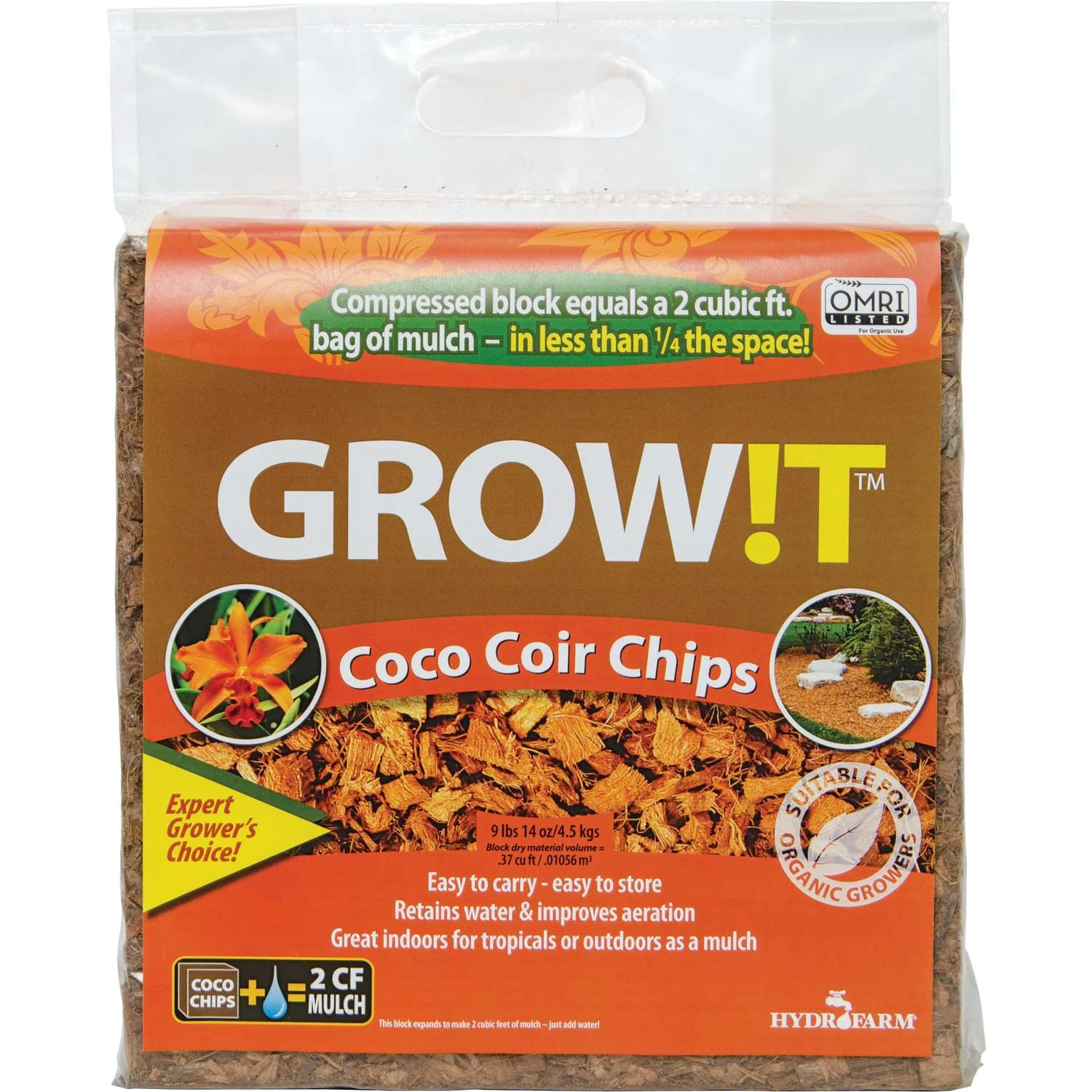 Use Growit organic coco coir planting chips to promote growth for tropical flowers and plants. It works both indoors and outdoors and is ideal for mulching and a decorative ground cover that retains water and resists fungus. Although each block of chips is equivalent to more than 2 cubic feet of mulch, it is lightweight. Add the Growit mix into your growing system and notice the coco difference. Easy to carry and store Organic coco coir planting chips are great indoors for tropical or outdoors as mulch Perfect as hydroponic medium or aggregate for soil applications OMRI listed organic product