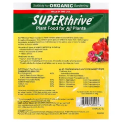 SUPERthrive Organic All-Purpose Plant Food contains all the macro-nutrients plants need throughout the growing season. This premium-grade granular fertilizer is made from 100% organic ingredients, including Mycorrihizae that help expand the surface area of roots for better nutrient and water uptake. Use with all types of organic gardening, including outdoor flower and vegetable plants, indoor houseplants and bonsai, trees and shrubs. 100% organic ingredients With Mycorrihizae to help increase water and nutrient absorption Unique vitamin solution with kelp Non-toxic ingredients Restores plant vigor